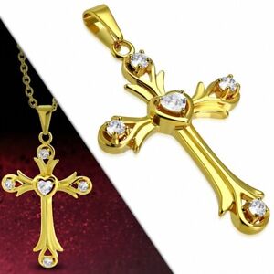Pendentif croix latine en acier inoxydable contour doré avec strass