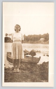Foto vintage de mujer mirando a distancia frente al bote de remos