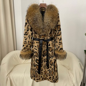 Chaqueta de piel de conejo real estampada de leopardo para mujer abrigos con cinturón cuello de piel de zorro trinchera