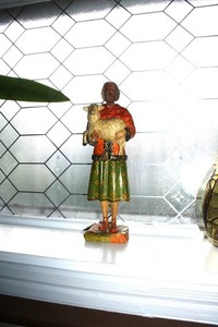 Estatua Presepe italiana napolitana grande vintage de madera tallada mujer llevando ovejas