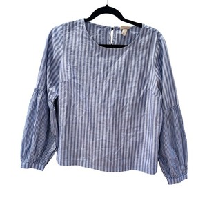 A New Day Blue White Stripe Cotton Blouse M Balloon Sleeve Cottagecore Top
