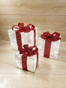 Set 3 Pacchi Regalo Natalizi Luminosi Bianchi LED Bianco Caldo Con Fiocco Rosso