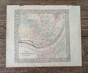 Mapa original de Cincinnati Ohio de Estados Unidos de 1870 por Mitchell coloreado a mano 15" x 12,5"
