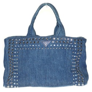 Bolso de Mano PRADA Canapa Cuentas Lona y Denim en Azul Índigo Grande Auténtico Bueno