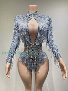 Women Sparkly Rhinestones Fringes Jumpsuit Dance Costume Bodysuit Stage Wear