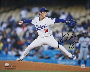 Fotografía de lanzamiento autografiada de 16" x 20" de Yoshinobu Yamamoto de Los Angeles Dodgers