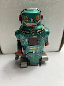 Juguete de cuerda litográfica de hojalata Mighty Robot. Verde. Japón. Clásico años 50