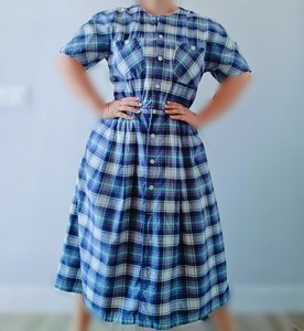 Hermoso vestido de mujer Peter Hahn de algodón, estampado tartán azul lila, bolsillos, 42-44