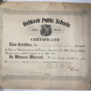Certificado de Escuelas Públicas Oshkosh 1911 Matthew N. McIver, Charles V. Nevins