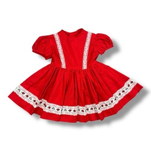 "Vestido de Niña Hecho a Mano de Colección Rojo Blanco Borde de Encaje Frutas Bayas Mangas Abullonadas 19x17"""