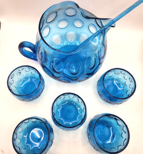 Jarra de vidrio azul vintage italiana Empoli - 5 vasos a juego