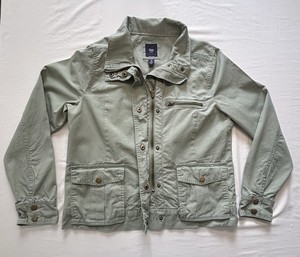 Chaqueta para mujer GAP verde salvia utilitaria con cuello militar talla mediana cierre de cremallera