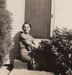 1938 Mujer Sentada Porche Elegante Vestido Hogar Arbustos Escena Natural Exterior