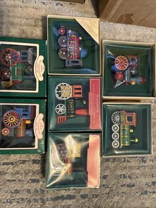 Lote de 7 mini adornos de locomotora de vapor LIONEL y sello de licitación conjunto de colección