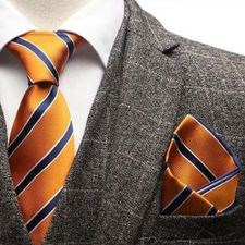 Corbata y pañuelo a rayas naranja y azul