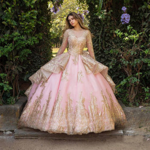 Exquisito Lujo Rosa Encaje Apliques Quinceañera Vestidos Manga Larga Baile de graduación Fiesta