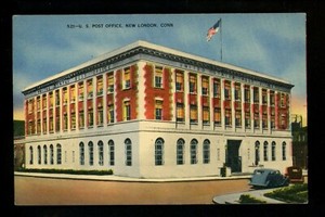 Post Office postcard Connecticut CT Waterbury flag cars street lamps
