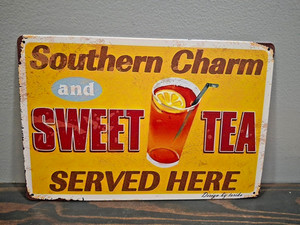 Letrero de metal Southern Charm and Sweet Tea servido aquí de 12 x 8 pulgadas