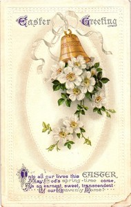 Postal de felicitación de Pascua vintage campana flores en relieve 1913
