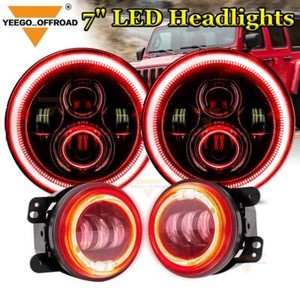 Red 7" Halo LED Headlights DRL + 4" Fog Combo Kit For Jeep Wrangler JK JKU 2007+