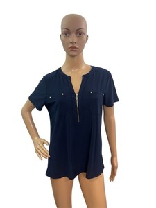 Blusa azul liso Anne Klein para mujer talla grande manga corta cuello con cremallera en V